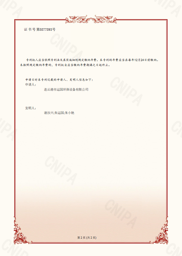 熱烈祝賀連云港市運(yùn)國(guó)環(huán)保設(shè)備有限公司獲得一種新型全自動(dòng)水過(guò)濾器發(fā)明專利證書。